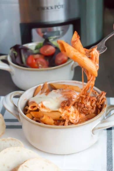 This dish turns out deliciously flavorful. And has all the rich cheesy goodness of chicken parmesan over pasta. It’s one of my favorite dinners. All the flavors you love made easily in a slow cooker. Perfect dinner for a busy night!