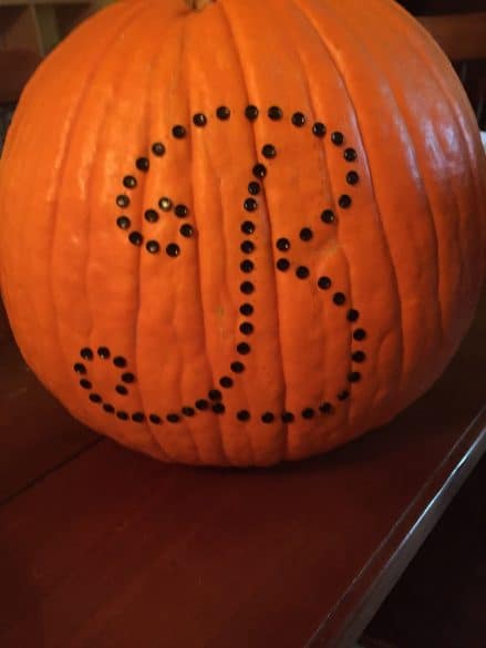 For a more sophisticated look, use furniture tacks or scrapbook brads. Just decide on a design, and then use a needle or thumbtack to “sketch” out your design on the pumpkin by poking tiny holes into it. Lastly, insert the tacks or brads directly into the pumpkin. That’s it! It is probably the easiest method I’ve ever used! This is a great way to make monogrammed pumpkins. You can also try swirls or your favorite team logo.