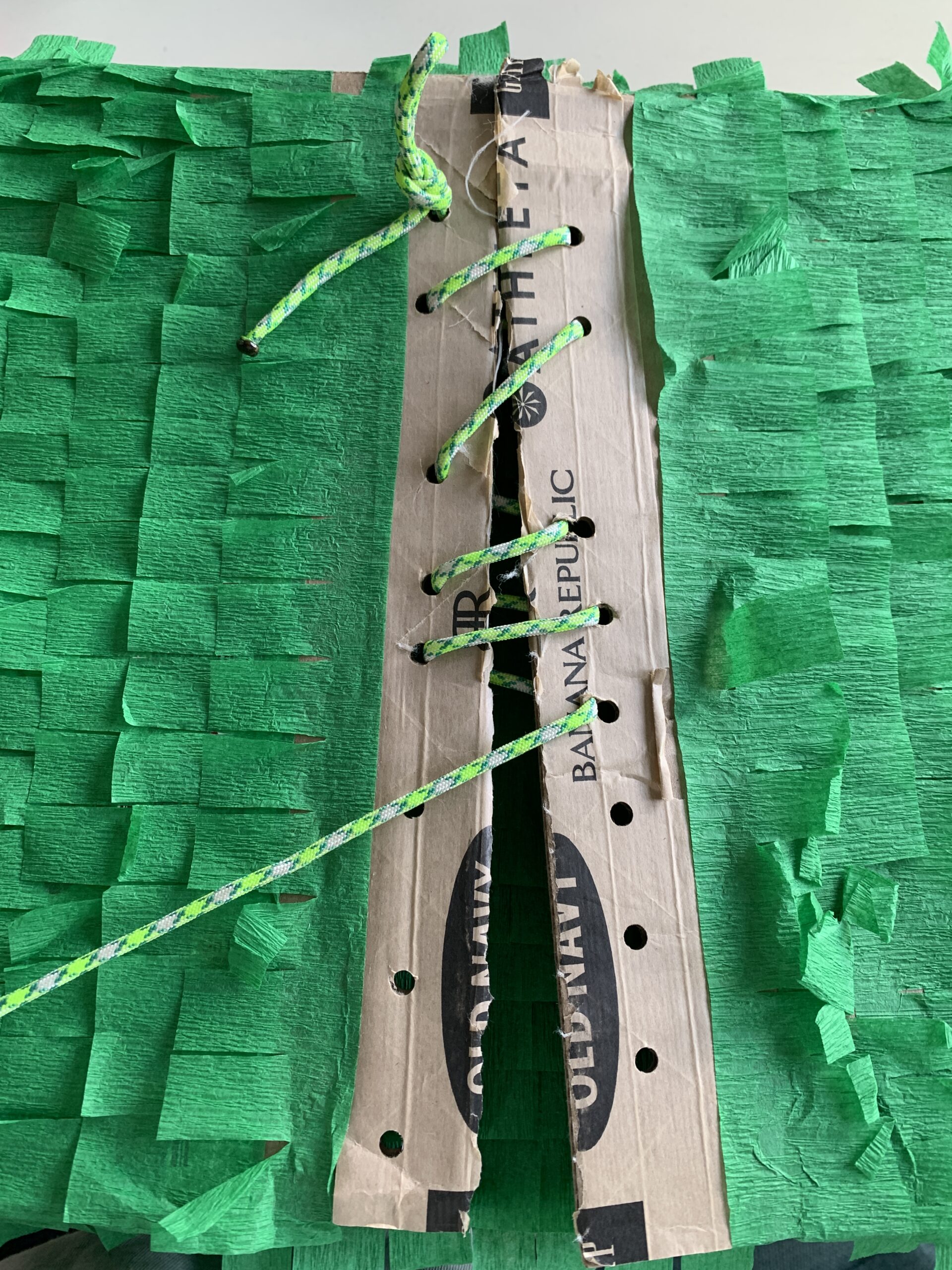 First things first, gather your supplies. You will need a cardboard box, glue sticks, green crepe paper and a piece of black paper (black construction paper works nice also), paracord (or some other strong rope/string to tie it shut), scissors and some candy. That’s it, you’ve finished the first thing!