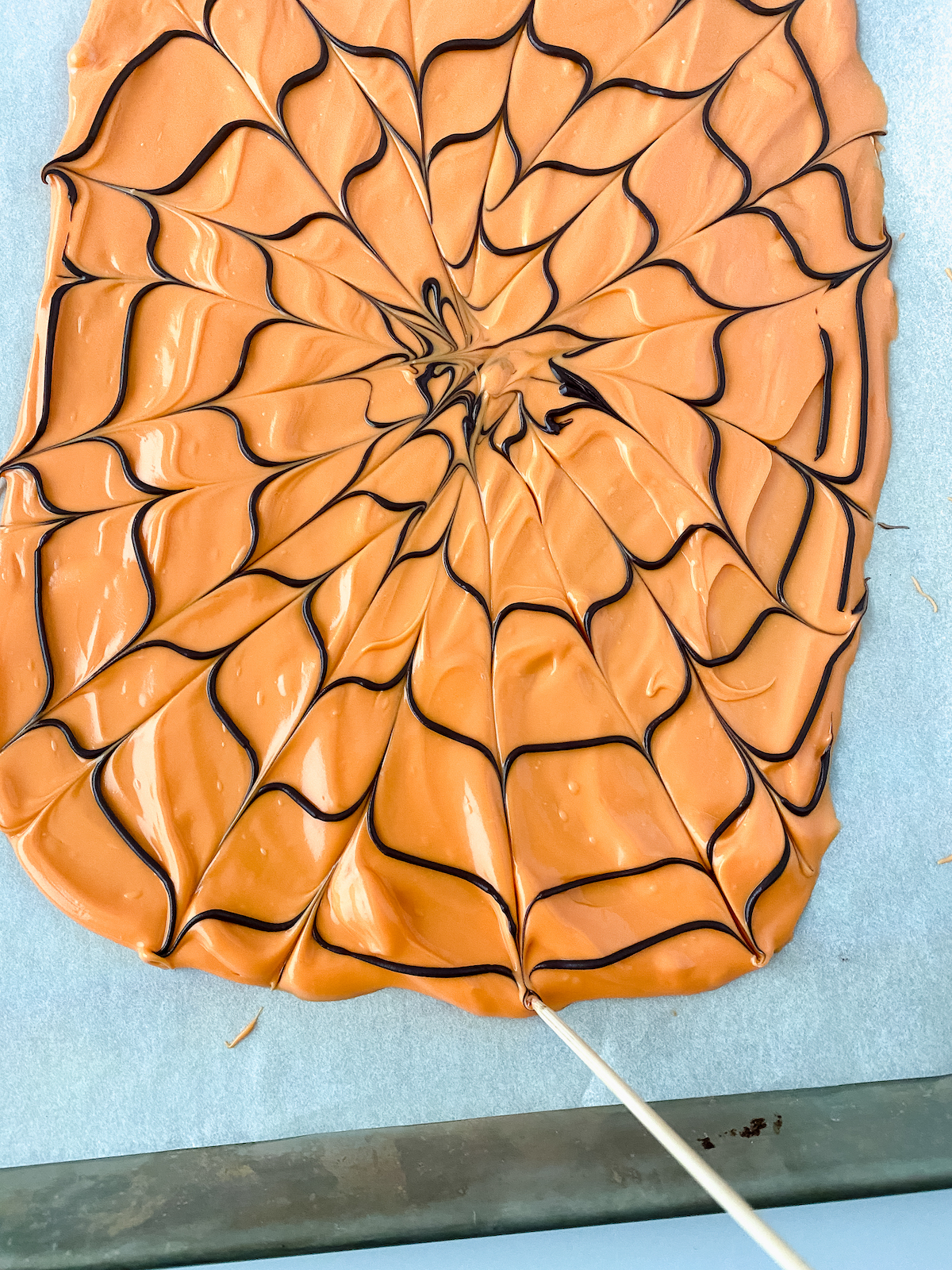 - In place of the black candy melts, you can melt some dark chocolate and drizzle it over top of the orange melted candy to craft this easy Halloween dessert.