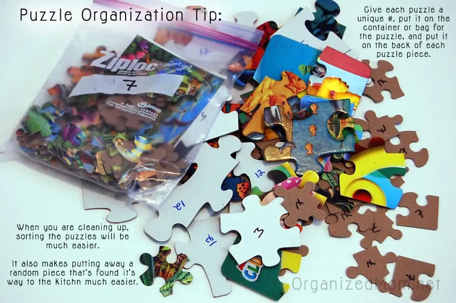 My son is obsessed with puzzles. I mean OBSESSED. He loves to play with puzzles for hours and hours. By the time he’s done, I see a huge pile of puzzle pieces to help put away and organize. Luckily we have a system in place to get that cleaned up in a snap. Plus even at his young age, he can help put them away AND teach him matching numbers.