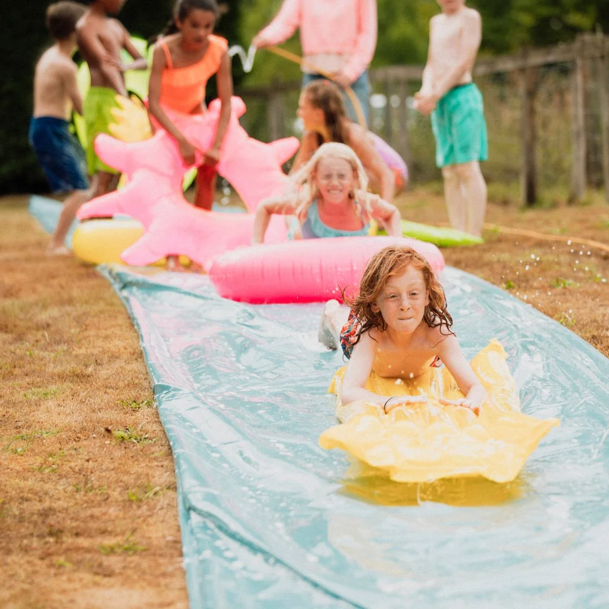 slip and slide kickball, flip cup, buckets,